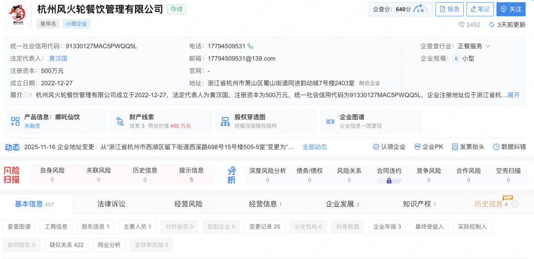 记者调查了解到,哪吒仙饮的运营主体始终处于变动中。企查查显示,最早以“哪吒仙饮”名义开展业务的“哪吒仙饮(山东)饮品集团有限公司”已于2024年12月注销,目前主导招商的是2025年7月由“杭州勇慧餐饮管理有限公司”更名而来的杭州风火轮餐饮管理有限公司。