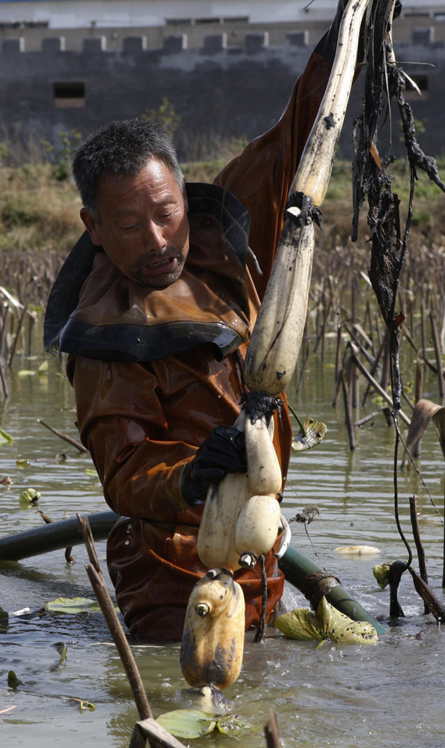 藕好吃,却难采。藕生长在深水下,采藕又都在深秋和严冬,荷塘冰冷,采藕人需穿着皮制连衣裤(防水衣)下水。采藕辛苦不说,还是个技术活。采藕当然要用手,但要用脚踩泥来判断藕的走向,故北园人把“采藕”形象地叫做“踩藕”。