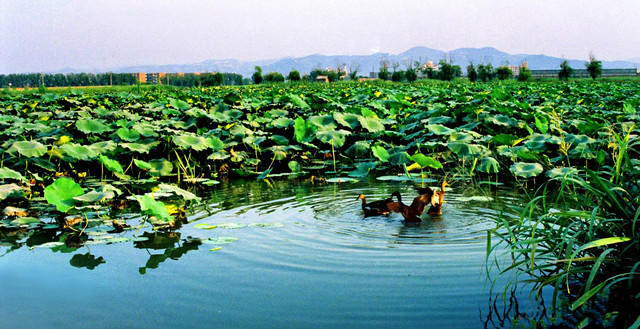 旧时济南,城北一片辽阔。府城及圩子城中的众多泉水,汇流为东、西泺河等水系,一路北行,将这片沃土滋润成烟波浩渺的湖泊,直抵鹊、华二山脚下,人称鹊山湖,湖中荷花连连,遂有莲子湖之别名。唐代段成式《酉阳杂俎》载:“历城北二里有莲子湖,周环二十里,湖中多莲花,红绿间明,乍凝濯锦。”
