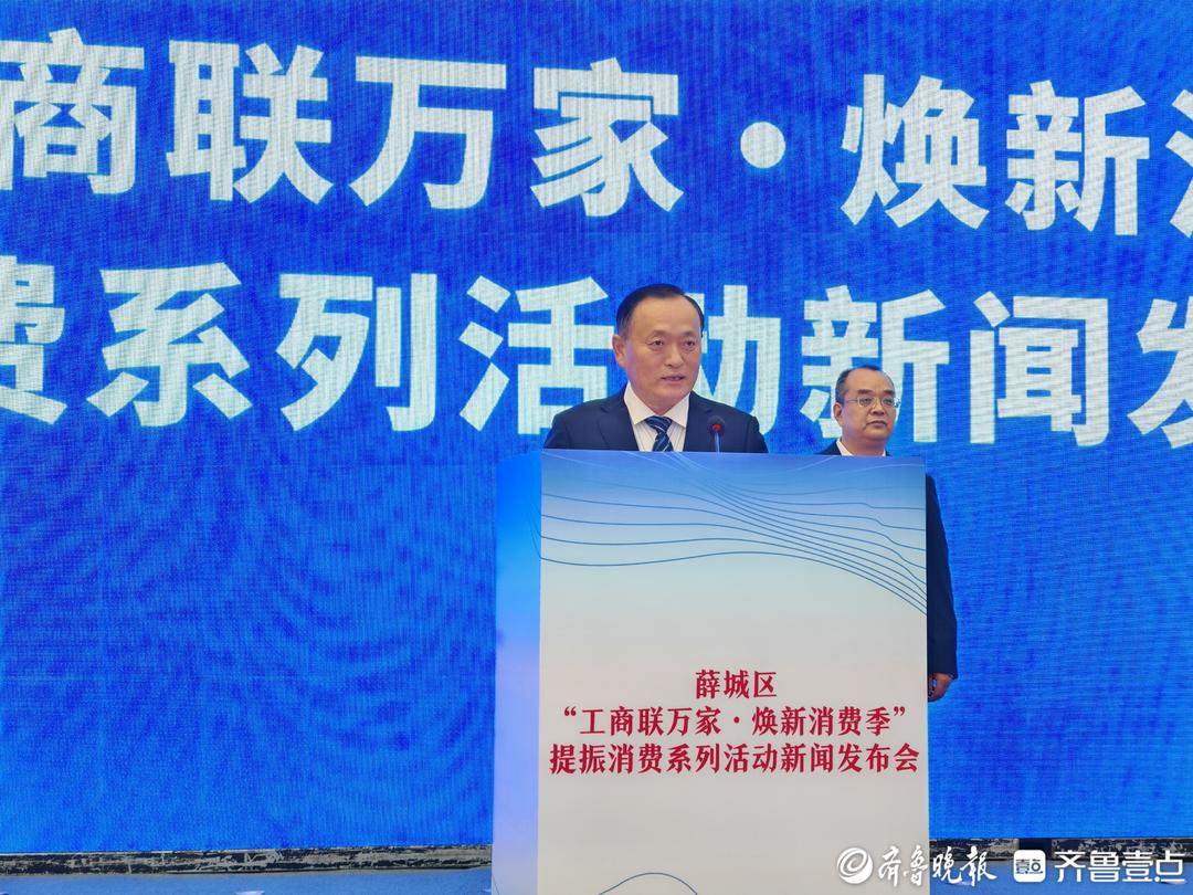 12月10日上午,薛城区“工商联万家・焕新消费季”提振消费系列活动新闻发布会,在枣庄市薛城区万达广场召开。会上薛城区委统战部副部长、薛城区工商联党组书记、常务副主席褚辉就薛城区“工商联万家・焕新消费季”提振消费系列活动情况进行了详细介绍。据了解本次活动将从2025年12月持续至2026年11月,将分阶段、分主题、分领域举办系列促消费主题活动,多渠道增加居民收入,多维度优化消费环境,多方式丰富消费体验。