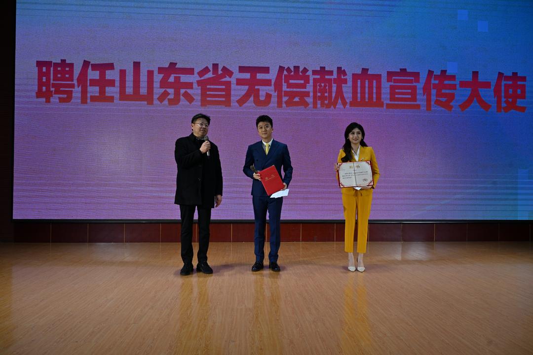 山东省卫生健康委员会医疗应急处二级调研员战涛为齐鲁电视台主持人李敬超、逯思彤颁发“山东省无偿献血宣传大使”聘书。
