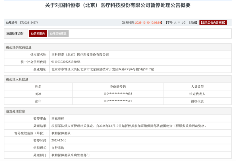 12月10日,军队采购网发布公告,国科恒泰(北京)医疗科技股份有限公司(以下简称“国科恒泰”301370SH)在军队采购活动中涉嫌存在违规失信行为。根据军队供应商管理相关规定,自2025年12月10日起暂停其参加联勤保障部队范围物资工程服务采购活动资格。