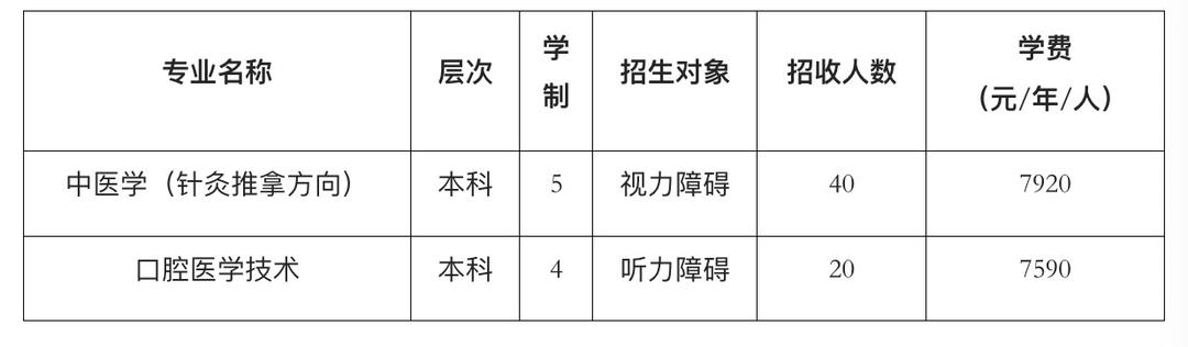 本次招生设置两个特色专业,其中中医学(针灸推拿方向) 计划招生40人,招生对象为视力障碍考生;口腔医学技术专业计划招生20人,招生对象为听力障碍考生。