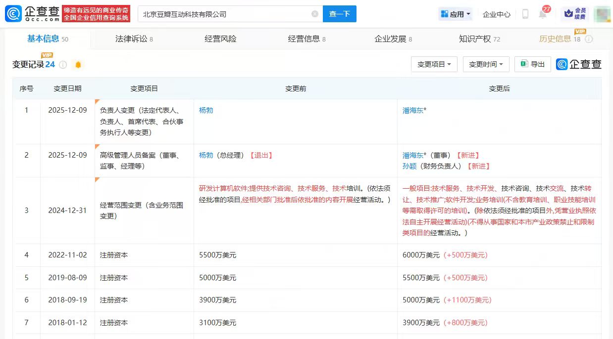 企查查APP显示,近日,北京豆瓣互动科技有限公司发生工商变更,豆瓣CEO杨勃卸任法定代表人、总经理职务,由潘海东任法定代表人、董事职务,同时新增孙颖任财务负责人。 目前,该公司登记有豆瓣社区答题互动平台、豆瓣播客音频节目播放网站平台前端系统、豆瓣社区打卡活动管理系统等多项软件著作权。 (企查查)