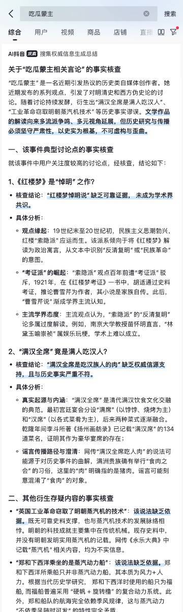 抖音辟谣团队的同事这两天一直在搜集权威媒体报道和资料,对这些热议的争议信息做了核查,初步梳理了10个不实或者争议较大的点。现在在抖音搜关键词,就能看到查证结果,对应的内容也在持续做处置。