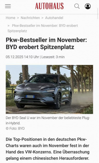 近日,BYD SEAL U(宋PLUS)成为德国11月车市插混车型销量冠军,引发行业广泛关注。这不仅是中国汽车品牌首次在德国主流细分市场登顶,更意味着比亚迪在欧洲的规模化突破已进入全新阶段,印证了中国新能源车海外的深度认可。