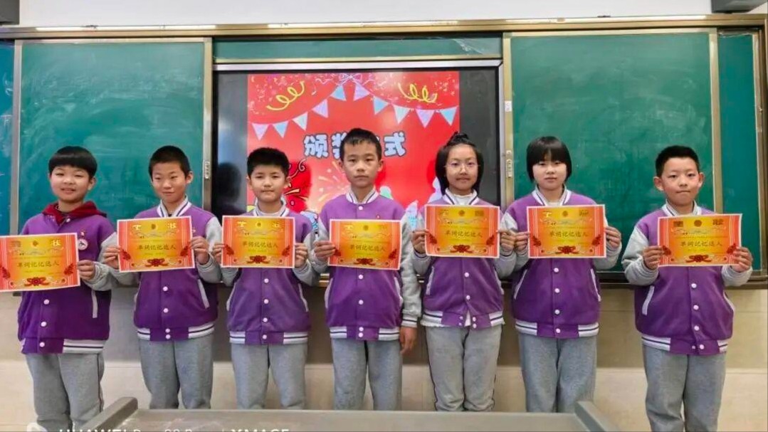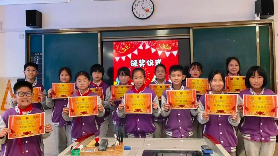 赛后,郭宁逐词细致批改,对各维度成绩进行分项统计。结果公布环节现场氛围热烈:20名学生获评“单词记忆达人”,8个小组斩获“优秀学习小组”称号,获奖师生互相击掌庆祝;班级比拼中,五年级二班以微弱优势胜出,赢得“免英语作业一次”的奖励,全场响起欢呼雀跃声。