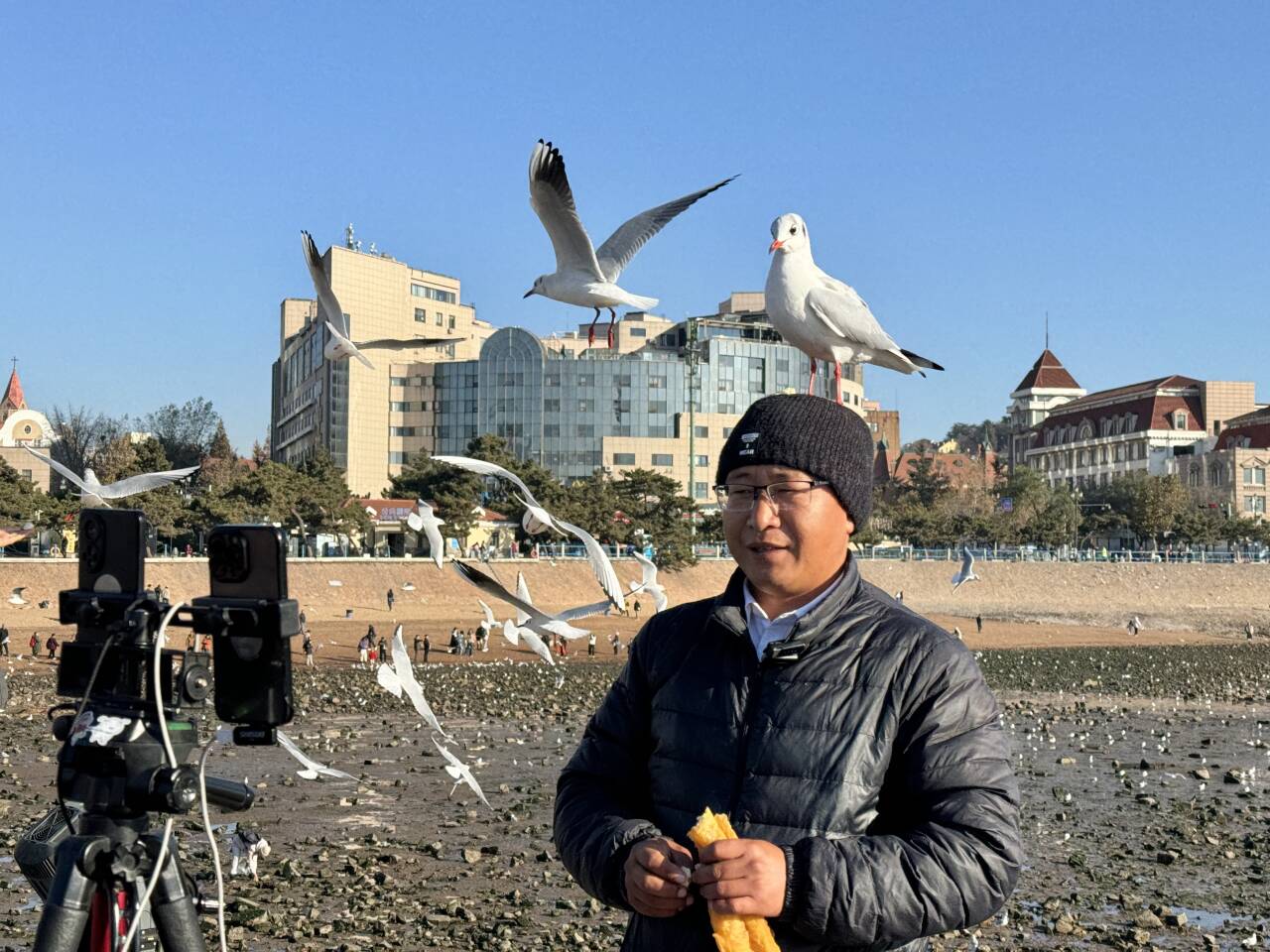 冬日七点的青岛栈桥,海风裹着明显的凉意,李视昌已提着两大袋鼓鼓囊囊的油条站在海边。“嘎嘎嘎——”几声清脆的鸣叫划破晨雾,他抬头笑眼弯弯:“它们认得我。”话音未落,几只红嘴鸥便扑棱着翅膀争先飞来,熟练地啄食起他手中、帽子上的油条。