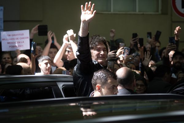 10月26日,阿根廷总统米莱(中)在首都布宜诺斯艾利斯一处投票点外向选民挥手致意。(新华社)