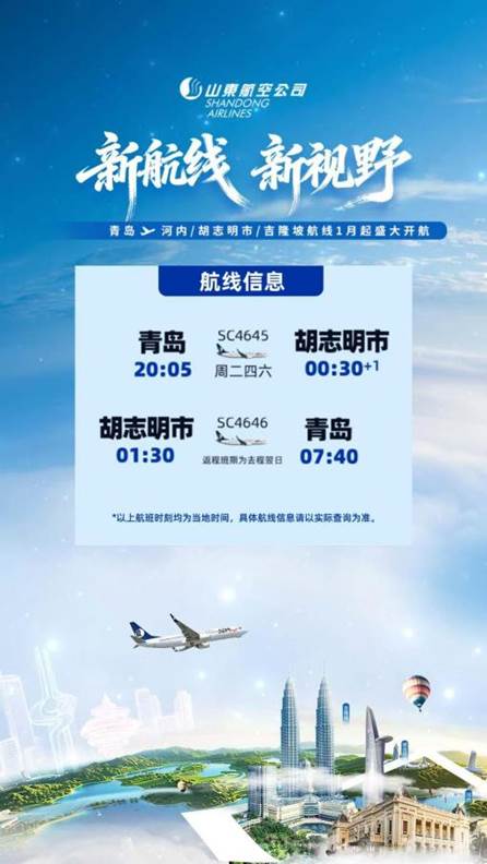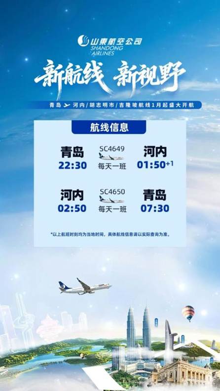 2026年1月起,青岛机场联合山东航空将陆续开通青岛直飞越南河内、胡志明市两条航线,为广大旅客探索东南亚的文化魅力与热带风情,提供便捷直达选择。
