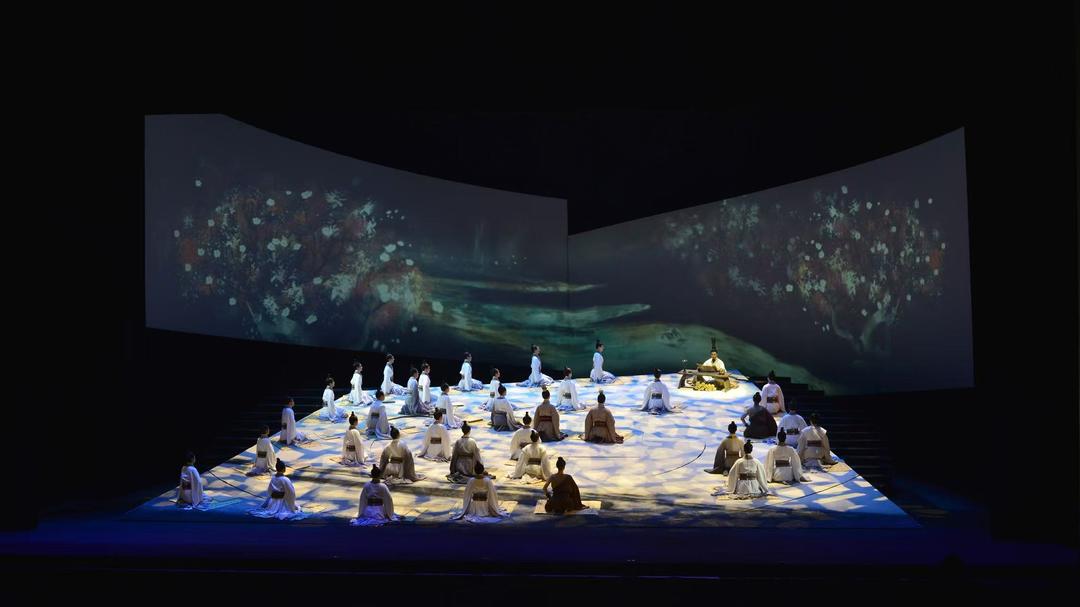 话剧《孔子》借助了数字技术,使儒家文化的诠释方式从语言文字变为了繁复多变的舞台视听元素。在第一场《君子》结尾处,孔子带领弟子们在沂河边沐浴嬉戏,演员们用轻松舒展的肢体语言呼应了欢乐轻快的剧情氛围,舞台背景瞬时转为翠柳拂微波的画面,演员们依次吟诵的台词在屏幕上出现,伴着轻快的背景音乐,组成了视觉与听觉的双重呈现:“暮春者,春服既成,冠者五六人,童子六七人,浴乎沂,风乎舞雩,咏而归。”这句话出自《论语·先进篇》。孔子让弟子子路、冉有、公西华、曾皙谈谈他们的志向,这句台词就是曾皙的答案,他的回答得到了孔子的赞同。这句话描述的闲适场景,代表了孔子理想中的社会愿景。话剧对这句话的诠释是直观的、感性的、充满色彩的,对于一些对儒家文化知道得少的观众而言,更是生动的、有趣的,易于理解的。