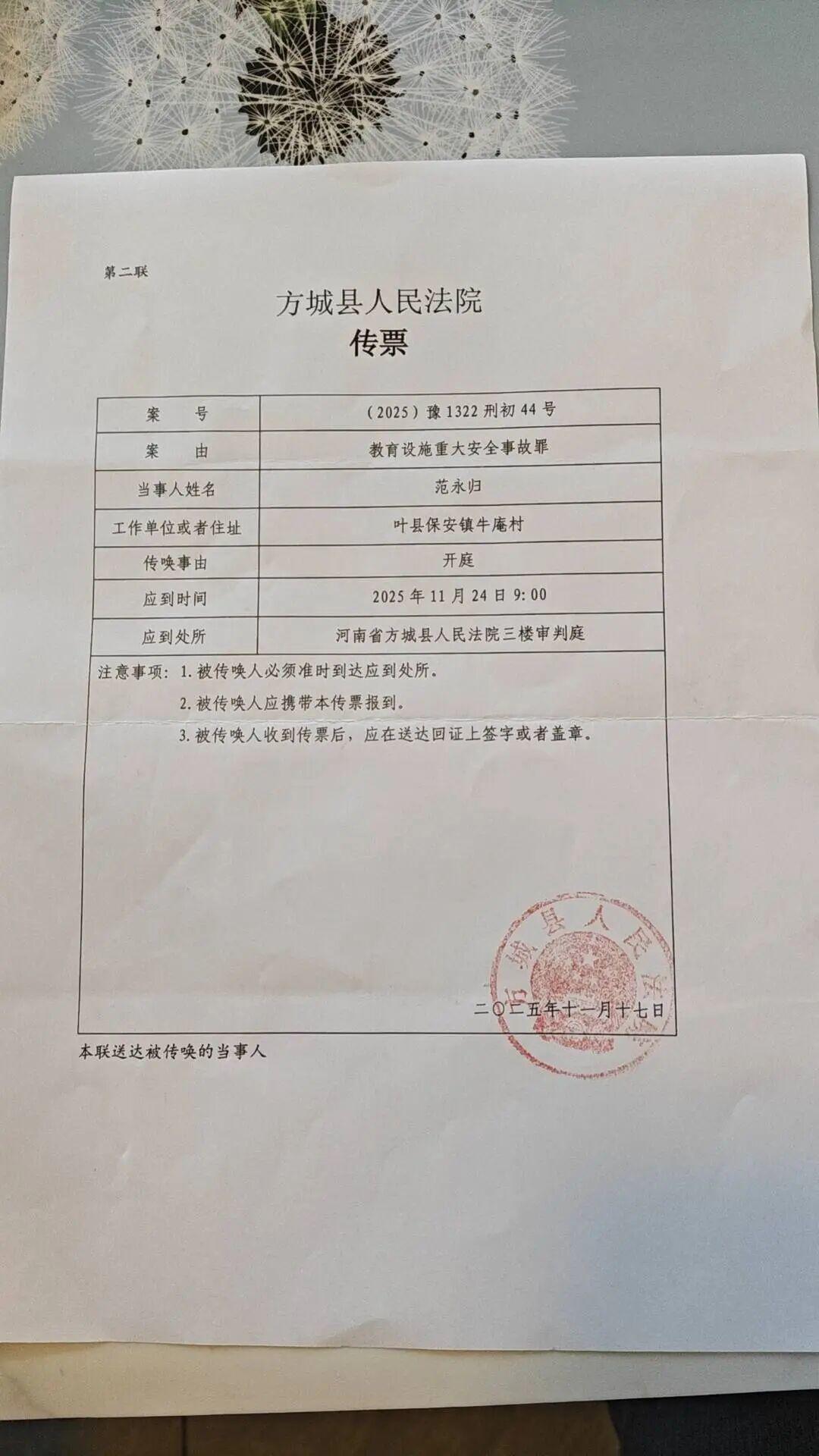 2025年10月23日,范永归收到方城县人民法院的传票:“教育设施重大安全事故罪”一案于10月29日开庭。范永归原本以为事情有所进展,正与律师沟通此事时,法院以对方律师没时间为由延期开庭。11月20日,他再次收到该法院传票,通知11月24日开庭,但等来的又失望。